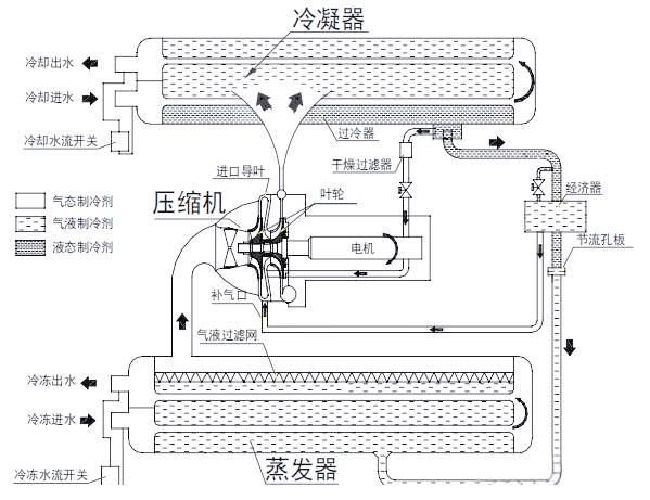信然磁悬浮主题空调的制冷道理效力蒸汽压缩轮回制冷,其主题部件征求双级制冷轮回、可调导叶安排机构以及磁悬浮压缩机。正在制冷流程中,压缩机对制冷剂蒸气施加能量,擢升其压力和温度。随后,过程冷凝和两次撙节,这些蒸气转化为低温、低压的制冷剂液体。这些液体正在蒸发器内蒸发为蒸汽,并从周遭境遇(如冷冻水)中招揽热量,从而低落载冷剂的温度,竣工人工制冷的成效。全面流程包罗压缩、冷凝、撙节和蒸发四个要害合头。